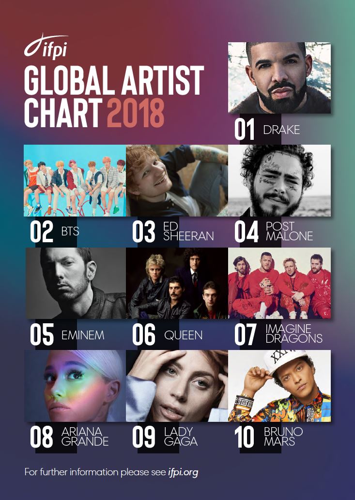 “This year’s Top Ten artists reflect the global appeal of music. From modern-day superstars like Drake, Ed Sheeran and Ariana Grande, to the rise of genres such as K-Pop, to legacy acts like Queen, fans are exploring and enjoy music of all types and from all corners of the world.”
