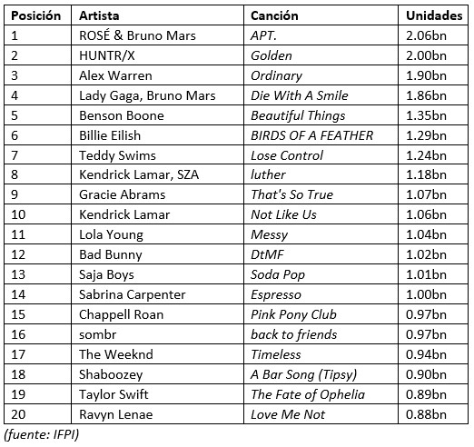 20 de febrero de 2026: La Federación Internacional de la Industria Fonográfica (IFPI) ha confirmado que APT., la colaboración entre Rosé y Bruno Mars, es el sencillo más vendido del año 2025, tras uno de los años más competitivos en la historia de la lista.