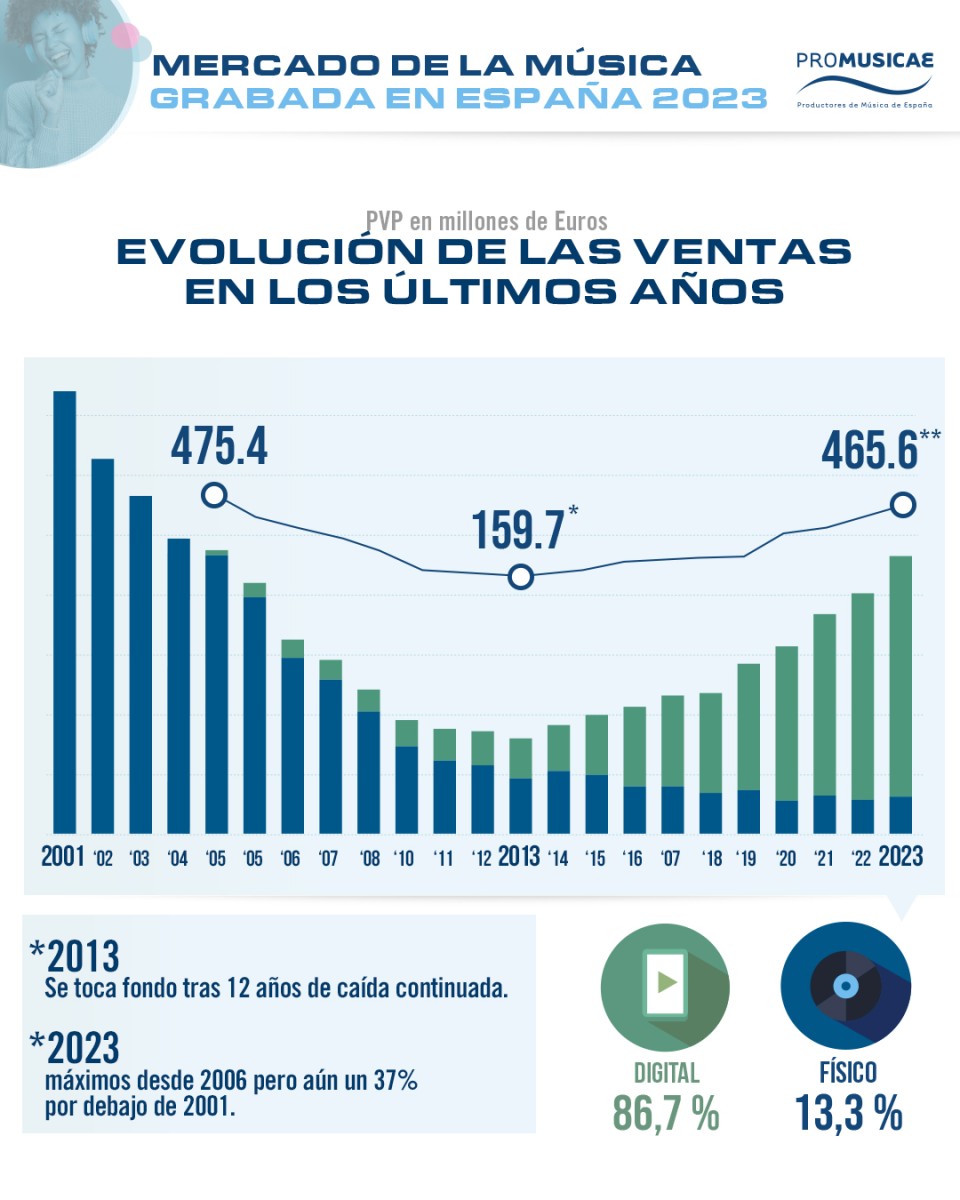 El mercado digital supone ya más del 86% de la música consumida en España (403,5 millones) en un ejercicio en el que las ventas físicas crecen respecto a 2022 (anotando 62 millones).