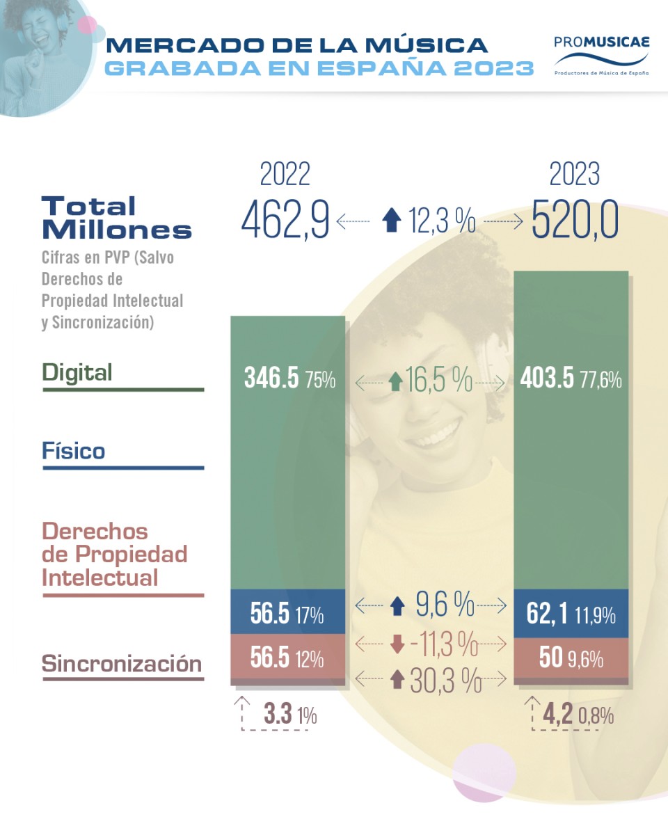 [12 de Marzo de 2024].- 2023 ha sido otro buen año para el mercado de la música grabada con unos ingresos totales, a su cierre, de 520 millones de euros, que suponen un 12,33 % de crecimiento respecto a los 462,9 millones alcanzados en 2022. Estos números abren el balance económico publicado hoy por PROMUSICAE, la entidad que agrupa a más de 95% del mercado discográfico español, que detalla las ventas de música en formato digital y físico (en valor de precio de venta al público), las sincronizaciones (utilización de música en publicidad o creaciones audiovisuales) y los ingresos derivados de la gestión de derechos de propiedad intelectual de artistas y productores. El 88,6% de esta cifra global la generan las ventas de música en su conjunto con 465 millones, alcanzando máximos históricos de 2006, pero aún un 37% por debajo de los niveles de 2001.