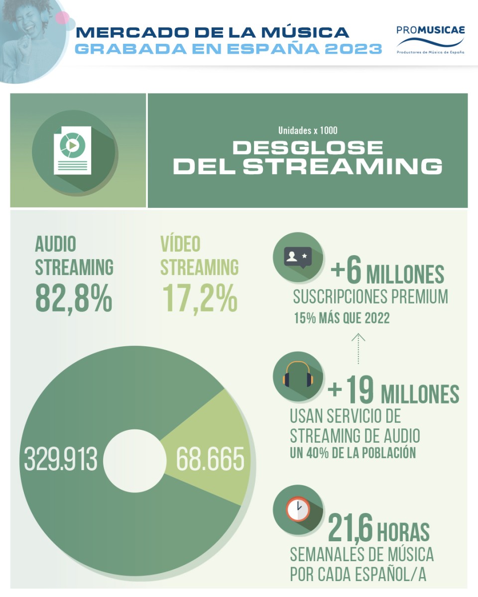Un año más en 2023 se mantiene la tendencia de crecimiento del consumo de música vía streaming en el mercado español. De los 403,5 millones de euros que llegan a la industria por las ventas digitales, casi un 99% proviene del streaming, que supone 398,6 millones de euros. De éstos, las plataformas de audio aportan a la industria 330 millones frente a los 69 millones que provienen del vídeo (muy por debajo en este caso de su peso en el consumo de música que, según el informe Engaging with Music 2023 de IFPI, supone un 30% en nuestro país).