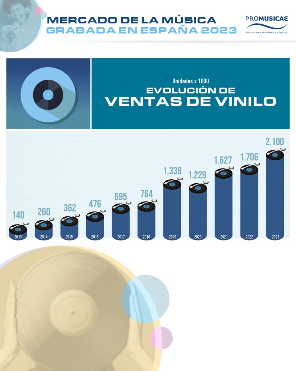 El mercado físico ha arrojado en 2023 cifras positivas que refrendan, entre otros datos, que el vinilo continúa aportando buena parte de los ingresos. En 2023 se ha vuelto a crecer, como ya viene ocurriendo en la última década, con un ascenso del 19% en los ingresos que lo mantiene por encima del 56% del mercado físico en facturación, generando un valor de 35 millones de euros frente a los 26 que aporta el CD, casi la misma cifra que el año anterior, que ahora supone el 42% de las ventas de producto físico.