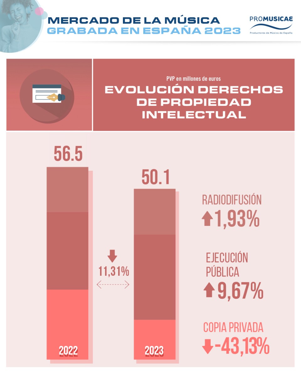 Los ingresos que recibe la industria en concepto de derechos de propiedad intelectual han aportado, durante 2023, 50 millones de euros, y aunque respecto a 2022 la cifra ha decrecido un 11%, cabe recordar que la cifra del ejercicio anterior estaba un poco distorsionada por la recuperación de ajustes pendientes por la copia privada.