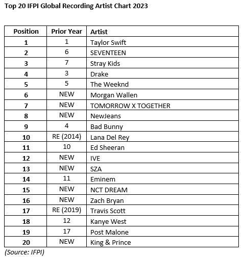 Las estrellas del K-Pop SEVENTEEN y Stray Kids ocuparon el segundo y tercer puesto, respectivamente, en un año récord para los artistas coreanos. Cuatro artistas de K-Pop aparecieron en el Top 10 con TOMORROW X TOGETHER en el n.º 7 y NewJeans en el n.º 8, mientras que IVE y NCT Dream también hicieron su primera aparición en el Top 20 de la IFPI Global Artist Chart, en los puestos n.º 12 y 15, respectivamente.