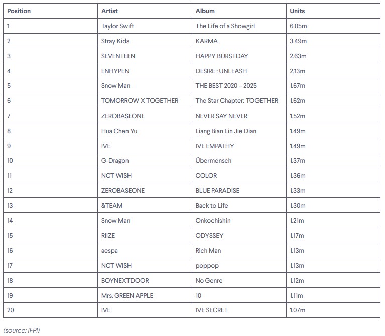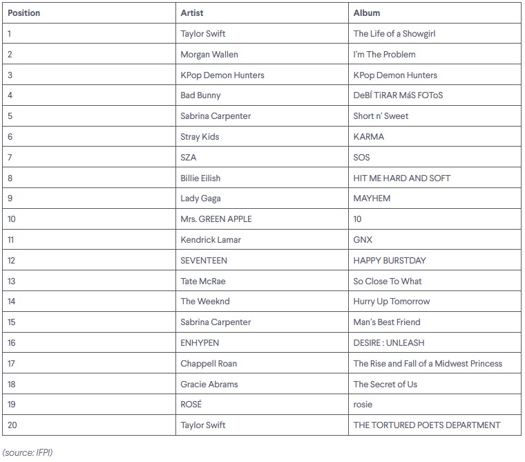 En la lista global de álbumes de la IFPI, la banda sonora de K-Pop Demon Hunters alcanzó el tercer puesto, respaldada por una fuerte promoción en distintos medios, mientras que el grupo japonés Mrs. GREEN APPLE logró que su primer álbum, 10, estuviera entre los diez más vendidos a nivel mundial, ocupando el décimo puesto.