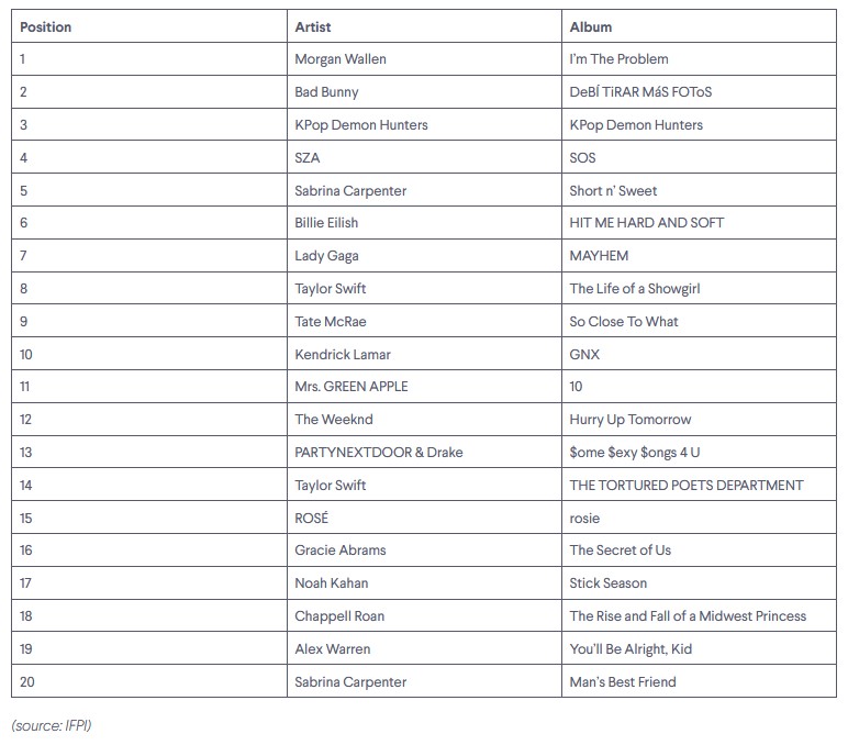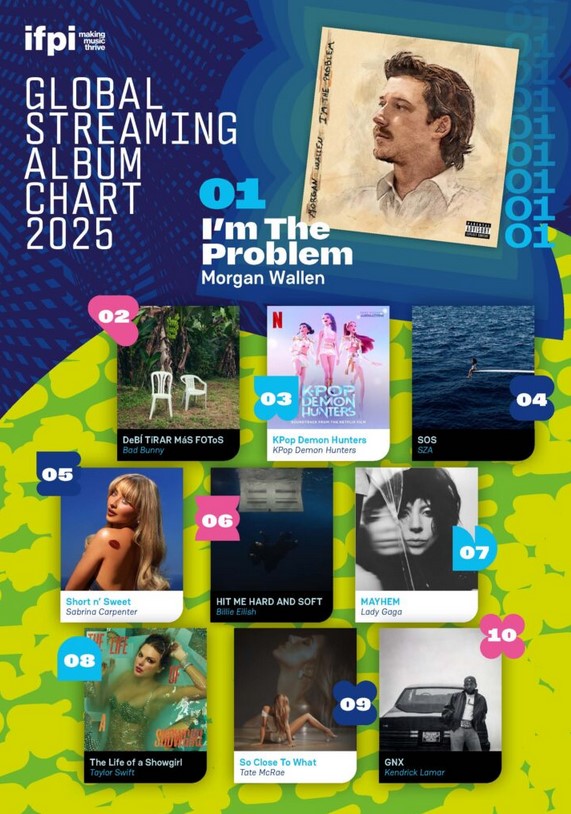 La lista global de álbumes en streaming de la IFPI destacó diferentes patrones de consumo, con I'm The Problem, de Morgan Wallen, encabezando la clasificación, su segunda victoria en el premio al álbum global en streaming en tres años, mientras que Bad Bunny le siguió en el número 2 con DeBÍ TiRAR MáS FOToS, el cuarto álbum más vendido a nivel mundial en todos los formatos, respaldado por sólidas estrategias de lanzamiento digital.