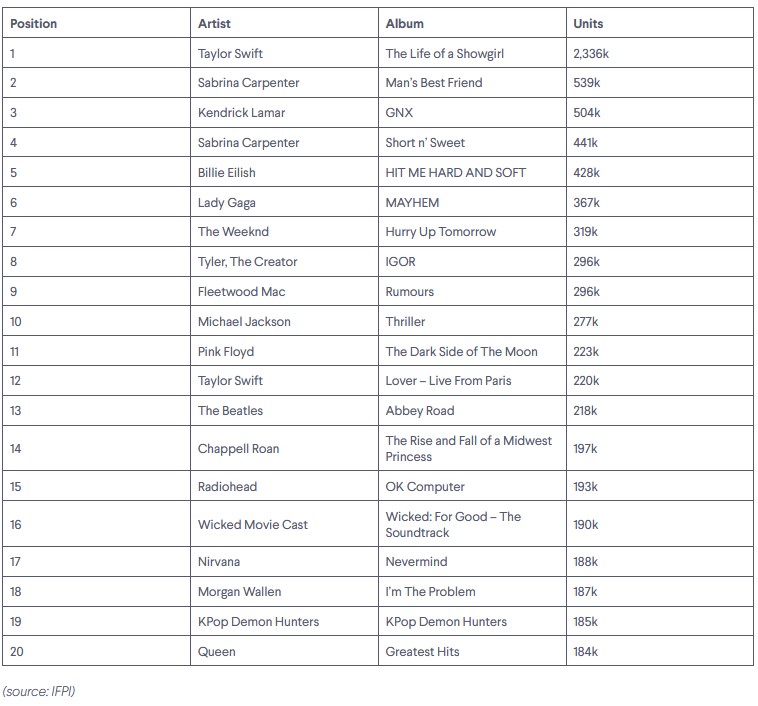 Top 20 de la lista mundial de ventas de álbumes de la IFPI en 2025