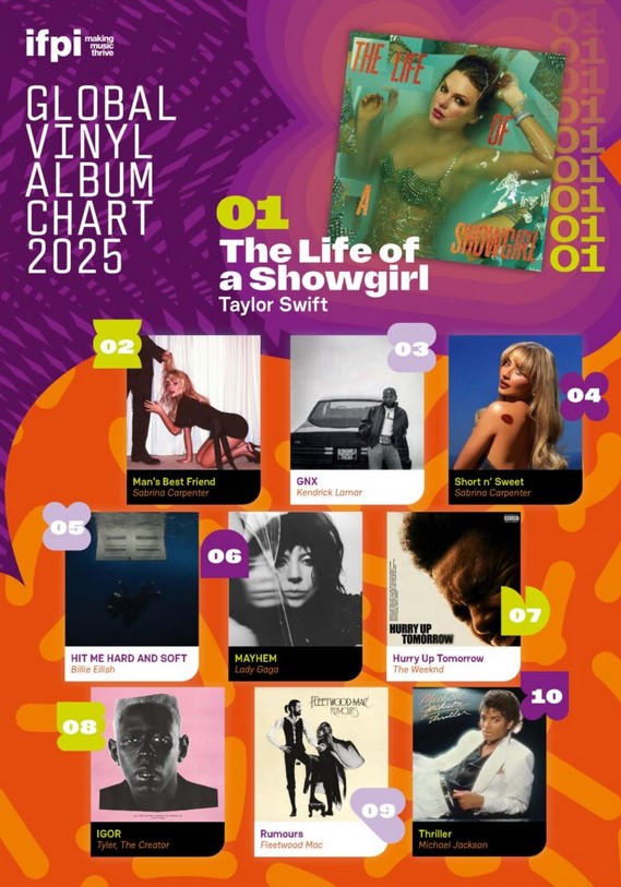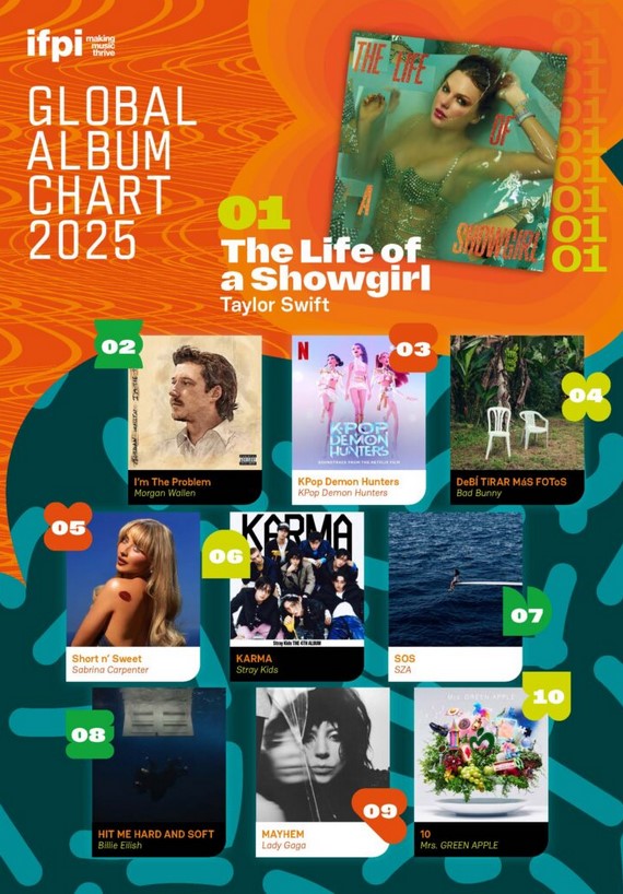 23 de febrero de 2026: La Federación Internacional de la Industria Fonográfica (IFPI) ha confirmado que The Life of a Showgirl, de Taylor Swift, es el álbum más vendido a nivel mundial en 2025, tras su extraordinario rendimiento en las listas mundiales de álbumes de la IFPI.